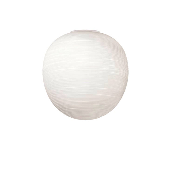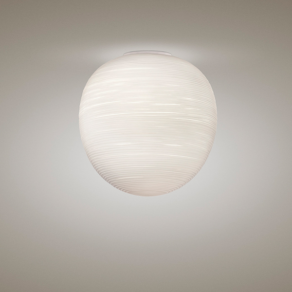 Collection of ceiling lamps with diffused light. Three diffuser shapes in blown glass with striped effect, achieved using a mould with negative decorations which are transferred to the surface of the glass, which is then manually ground “by belt” and then undergoes immersion in acid in order to emphasise the plaster-like effect. Ceiling mounting plate in epoxy powder coated metal.