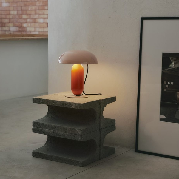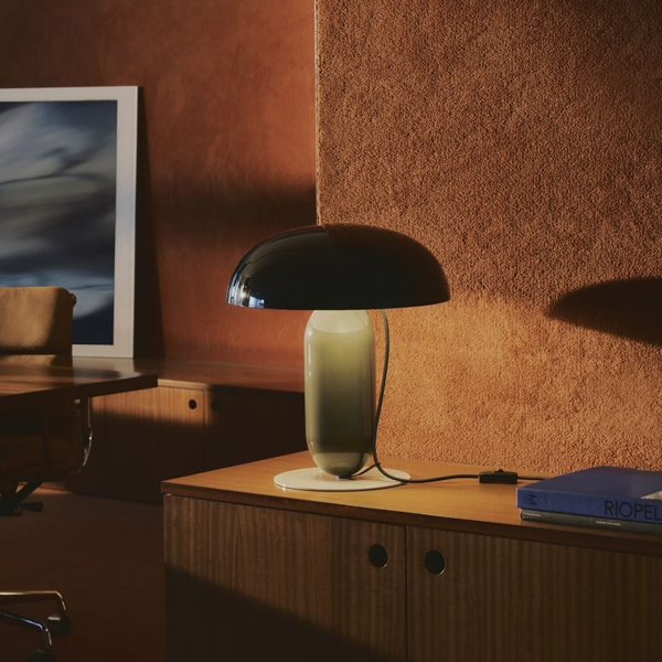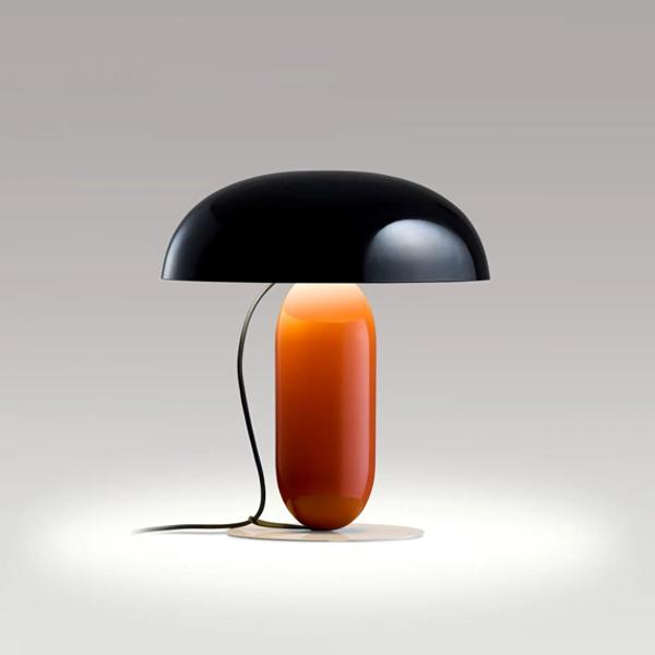 A lamp in balance. A modern take on the table lamp. The new Gambosa lamp looks like a balanced sculpture in sophisticated colours. Its creator, Mathias Hahn, has provided a modern take on the table lamp, a design that challenges the product’s traditionally static and rigid nature. A design, made of steel, that simplifies the structural elements of a table lamp (shade, stem and base), joining them together without them apparently being connected. Its curved shade seems to float delicately, adding a dynamic touch, whilst the stem is supported on a flat base, the only element to provide stability. Gambosa is a combination of geometries in balance that interact harmoniously with each other. However, the beauty of this table lamp doesn’t come solely from its composition; it’s defined by its palette of colours. The shade is available in pale pink or black, opaque versions that provide a direct light, or in opal methacrylate for softer illumination. The stem is available in orange and moss grey and the base in stone grey. This range of colours has created a matrix collection of different versions, each with their own aesthetic, from subdued to more expressive. It’s available in two sizes: 26 cm in diameter and 30 cm in height, and 36 cm in diameter and 41 cm in height. The cable also forms part of the lamp’s design, descending from the top while a clip guides it, anchors it and stops it from escaping, adding to the overall visual appeal. Gambosa is a revamped table lamp: familiar and recognised as such but surprising in terms of its contemporary shapes and colours.