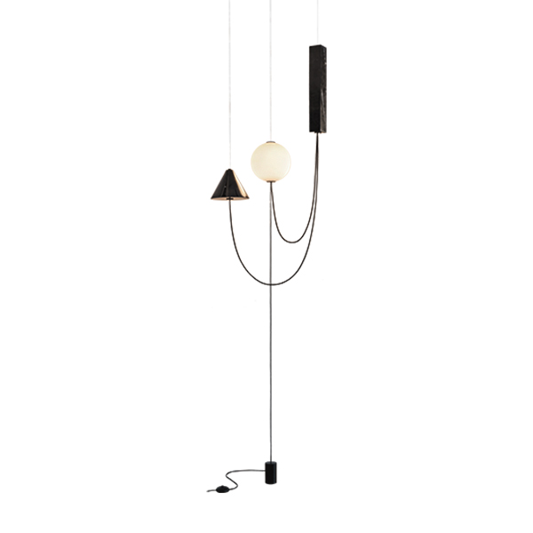 | Technical Details | Floor lamp with ceiling anchoring. Diffuser in cased blown opal glass. Black marble elements. Power cable with plug and integrated dimmer. |