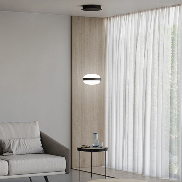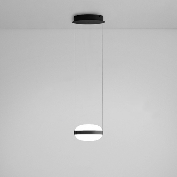 Beaded S is a family of pendant luminaires manufactured in aluminium and blown glass. Beaded is available in an individual version (S1) or in clusters of 3 or 5 light fittings (S3 and S5), as well as in a horizontal version with two or three luminaires (SH2 and SH3). Its double blown glass diffuser is available in opal white or smoke grey; the latter option contains a flat internal diffuser to prevent the light source from being seen. These luminaires can be freely installed at different heights, meaning they can be adapted to any height. The central aluminium ring is made with a textured matte black finish.