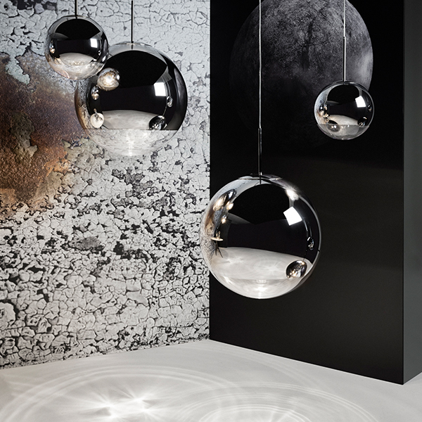 A highly reflective shade inspired by the space helmet. The Mirror Ball is created by exploding a thin layer of pure metal onto the internal surface of a polycarbonate globe. One of the most iconic products in the collection, it can be used solo or in muliples to create a dramatic feature. Also available in 50cm and 25cm and can be used with a pendant or floor fitting and can be hung in multiples using Pendant System.