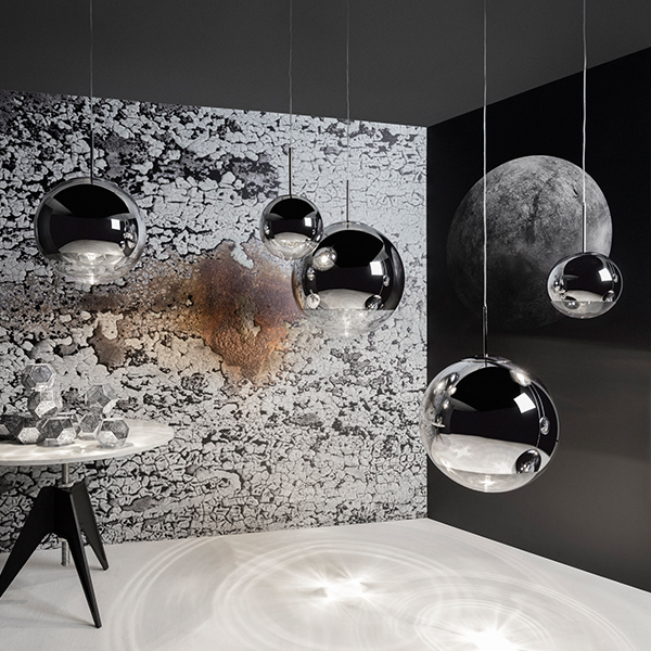 A highly reflective shade inspired by the space helmet. The Mirror Ball is created by exploding a thin layer of pure metal onto the internal surface of a polycarbonate globe. One of the most iconic products in the collection, it can be used solo or in multiples to create a dramatic feature. Also available in 25cm and 40cm and can be used with a pendant or floor fitting, and in multiples using Pendant System.