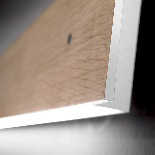 Wall lamp made from aluminium, with a polycarbonate shade and direct light (1L), indirect light (1L) or both (2L). Available in several finishes: matte grey, satin white, satin black, or oak veneer. Fluorescent or LED, two “on” settings and dimmer versions available. Other measurements, finishes, and emergency kit also available.