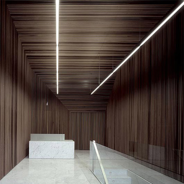 Suspension lamp made from aluminium, with an opal polycarbonate shade and direct light (1L), indirect light (1L), or both (2L). Available in several finishes: matte grey, satin white, satin black, or oak veneer. Fluorescent or LED, two “on” settings and dimmer versions available. Other measurements, finishes, and emergency kit also available.