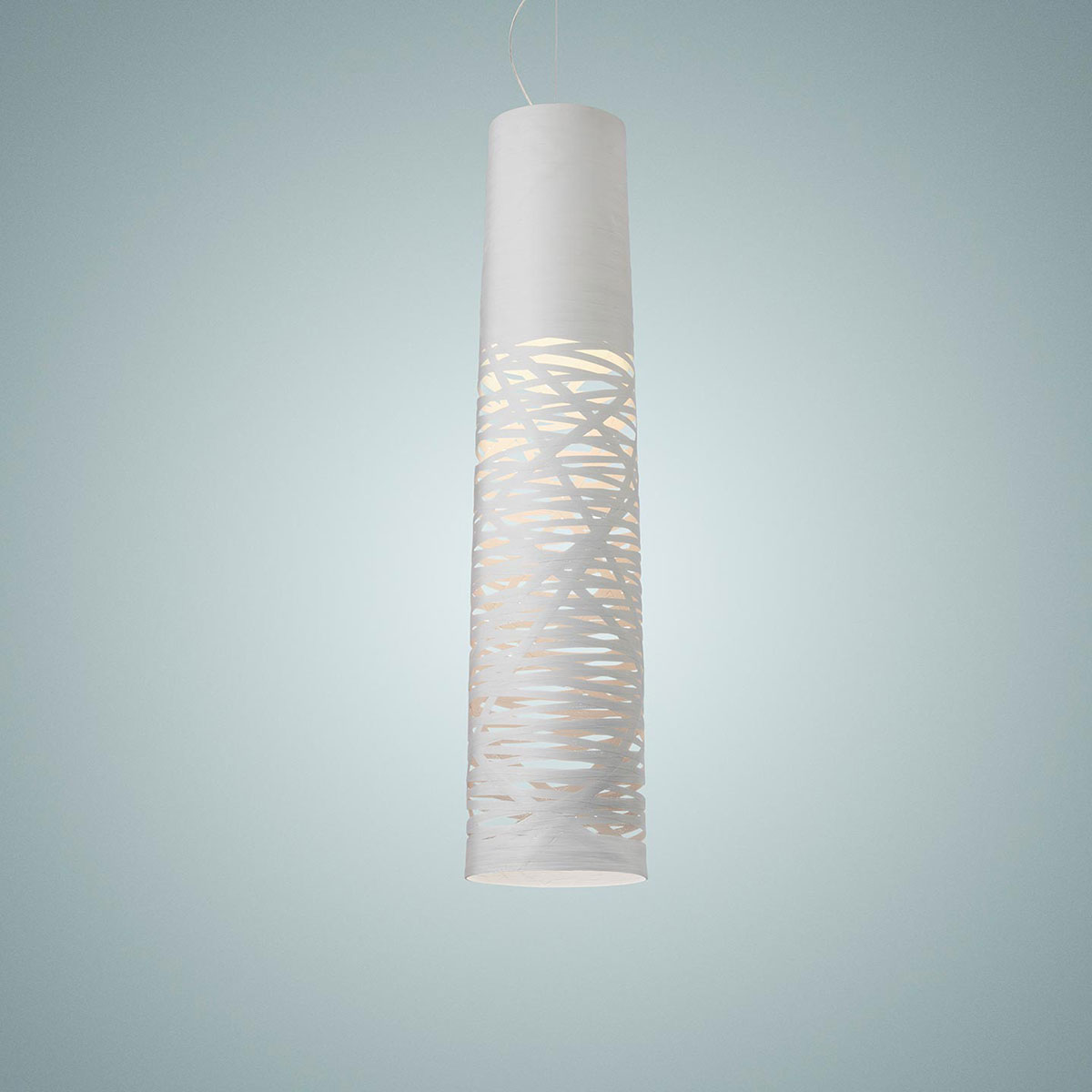 Technical Details | Suspension lamp with diffused and direct light. The fibreglass-based composite material diffuser is produced by modelling tape along amould with an automatic control of the pitch/pattern, which is then liquid coated. In the large version, blown glass internal diffuser with acid etched nish, satin nish opaline glass upper screen and chromed metal frame, in the other versions chromed metal mount. Fitted with three stainless steel suspension cables for the large version, one for the other versions, and transparent electrical cable. Ceiling rose with galvanised metal bracket and glossy chromed batch-dyed ABS cover. Canopy decentralization kit- multiple canopy available (up to 6 or 9 suspension lamps). |
