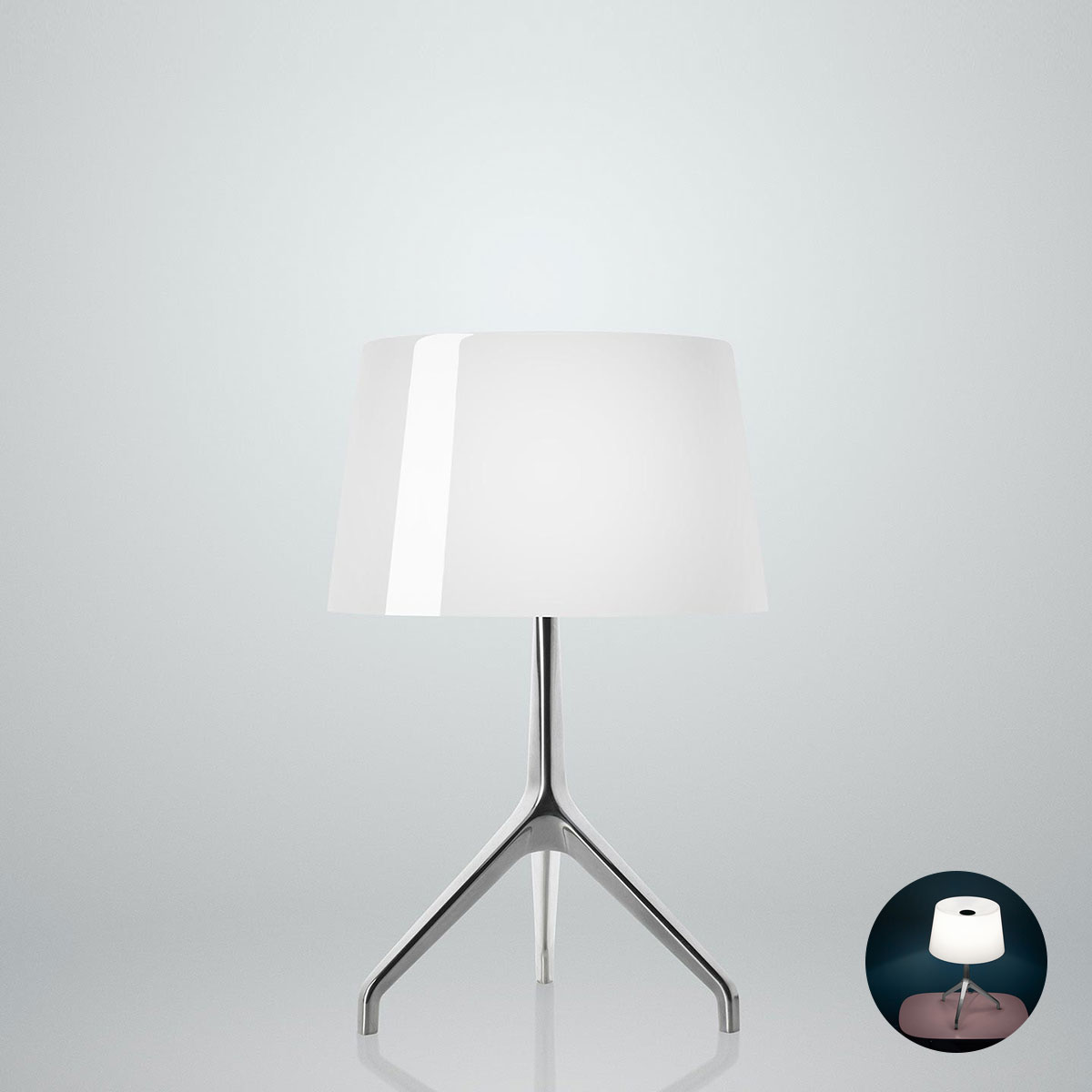 Technical Details | Table lamp with direct and diffused light. Hand-blown cased glass diffuser with glossy finish, white on the inside and coloured on theoutside. Die cast aluminium base and rod, hand finished and polished in the aluminium version, coated with liquid paint in the black chrome version. Dimmer for the gradual brightness adjustment. |