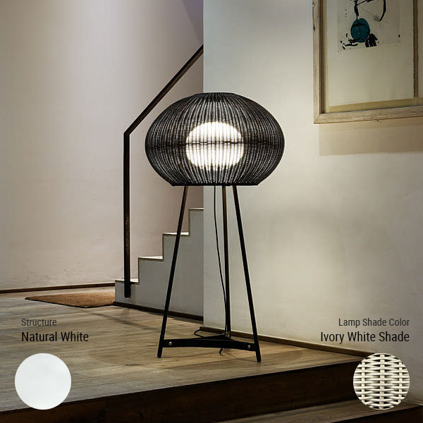 Material | Tall outdoor floor lamp with a tripod stand structure made of stainless steel, painted and cataphoresis treated that can withstand exposure to the elements. Lamp shade is composed of hand wrapped polyethylene synthetic fiber over aluminum frame |