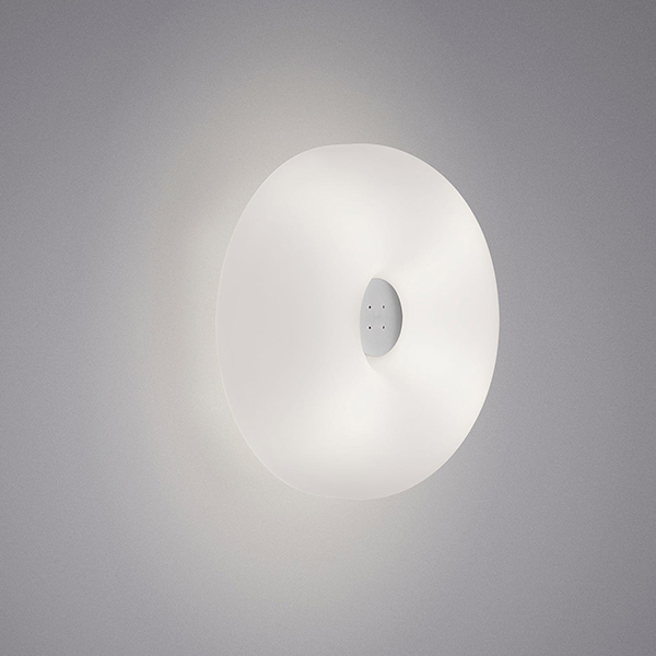 A soft shape made from blown glass appears fixed with a satin-finish metal button positioned in relation to the central hole. This is the distinguishing mark of Circus. The name evokes the lamp's circular outline; a shape that is always current, so much so that it has been a part of the collection since 1994. Available as a wall or ceiling lamp, Circus decorates with a simple, balanced character, underlined by the intense glow that filters from the white diffuser. The glossy surface enriches the basic shape of the lamp through an illusion of elegant reflections. The lamp is available in two sizes.