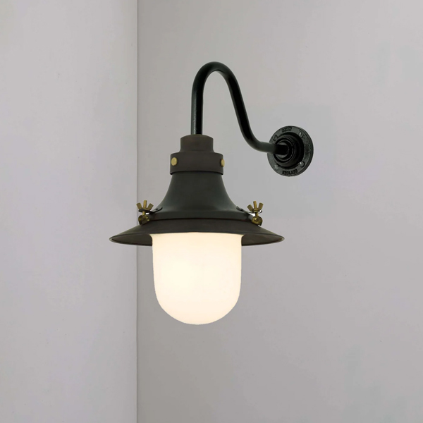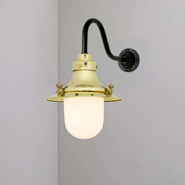 Small wall decklight spun in brass or copper and fitted with a clear or opal well glass. The range of finishes include polished unlacquered, weathered or matt black. The fitting is attached to a black swan neck bracket.