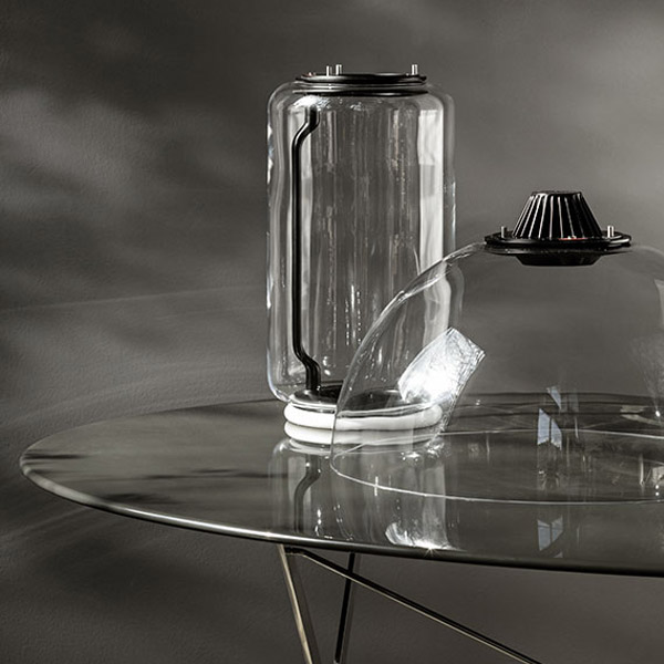 | Material | Cylindrical and semi-spherical transparent blown glass structure, suspended die cast aluminium ring connector, hydroformed steel internal lateral arm and injection moulded optical opal silicone outer ring diffusers. |