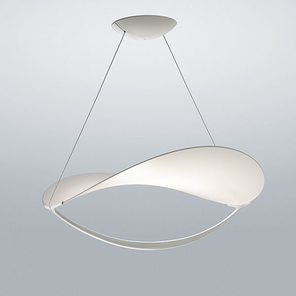 Moon, heaven’s feather (G. Ungaretti*). Plena takes its name from the full moon, the form of a light that makes people fall in love. Large in size but light and dynamic, Plena provides dual lighting: reflected on the surface below it, and spreading towards the ceiling. An intriguing light, of special charm, to completely permeate a room while remaining soft and enveloping. Placed over a table, Plena never emits the slightest glare. Two elements balance each other, performing a design gesture with an almost poetic intent: the lunar disk becomes a plume, thanks to the arched line that conveys a sensation of lightness and -ight. The fabric is magical: it embodies the form like a solid, yet requires no reinforcement, no muscle, for its perfectly natural gesture. Like a sail in the moment it is filled by the wind. Plena is a cradle that contains a light source, though the latter, like any true essence, is invisible to the eyes. A synthesis of form and function, performance and poetry, Plena is perfect for both domestic and commercial spaces. Its image changes, depending on the vantage point: it is a lamp that thrives on solitude, above a table, but also on repetition in vast areas like halls or large shopping areas.