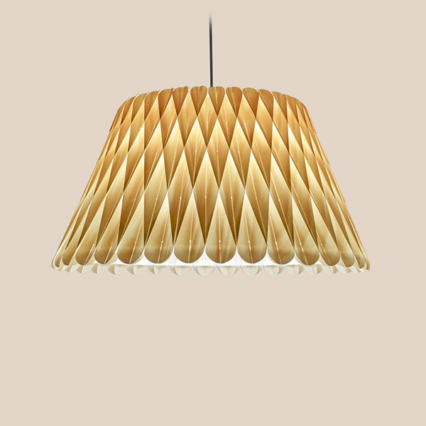 Lola is the latest lamp for LZF designed by long-time collaborator Ray Power. Showcasing Power’s ability to create imaginative three-dimensional forms, Lola is a conical lamp with an intricate geometric pattern. A veritable labour of love, Lola’s shape went through many iterations, drawings and prototypes. The end result is, without doubt, a marvel of lighting design. A particularly piquant Spanish name, Lola is very much alive, sensuous and intriguing. In a domestic or contract setting, Lola is a lamp that attracts and pleases the eye. Highly original and truly sophisticated, Lola’s complex veneer construction is both accentuated and softened when illuminated. Available in a number of sizes and LZF’s range of natural wood colours, Lola is stimulating, fascinating, arresting and sparkling: an especially piquant light.