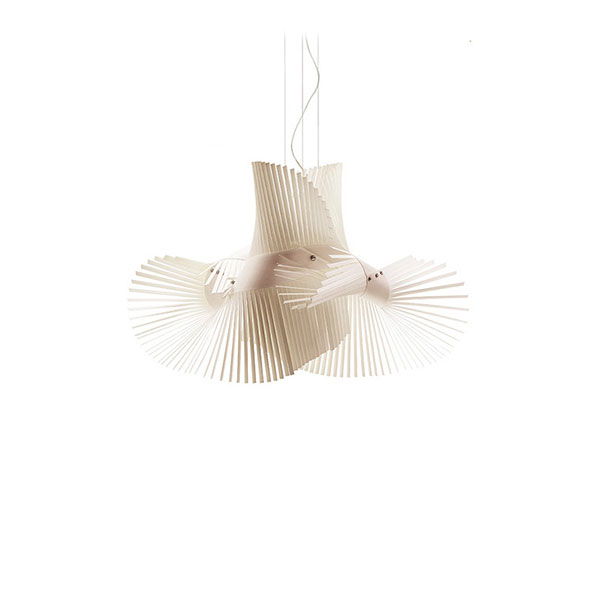 The Mikado light takes its names from the classic pick-up-sticks game, where sticks are bundled together and when released, fall in a circular jumble. A radiant light, Mikado’s wood veneer strips spread outwards, in a manner evocative of a bird’s plumage. Cleverly engineered, the Mikado’s form is both chaotic and harmonious at the same time. Designed by Miguel Herranz, the Mikado is a free spirit, possessing an air of nonchalance and a teasingly impish swagger. It is a light whose profile is like a coruscating kaleidoscope of pattern.