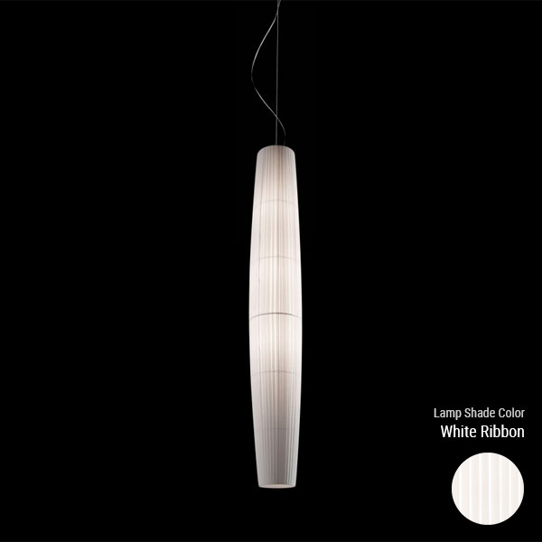 Material | Pendant lamp with hand wrapped translucent polyester blend ribbon with an internal iron frame. |