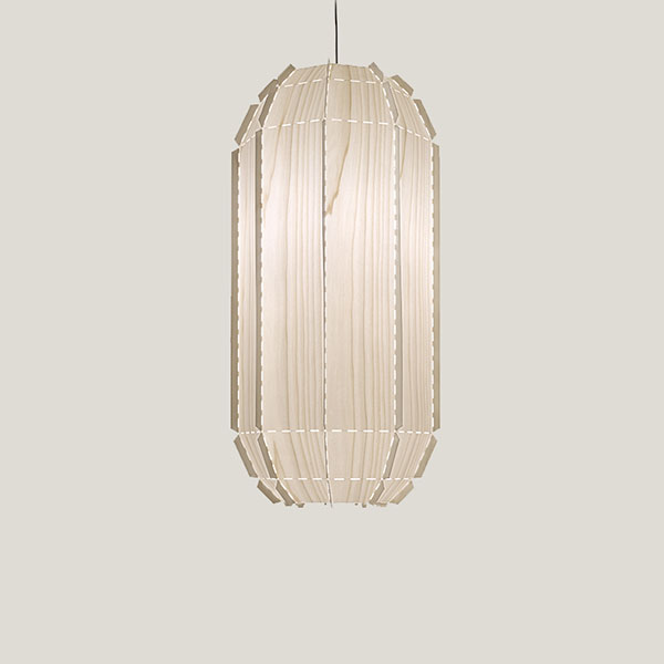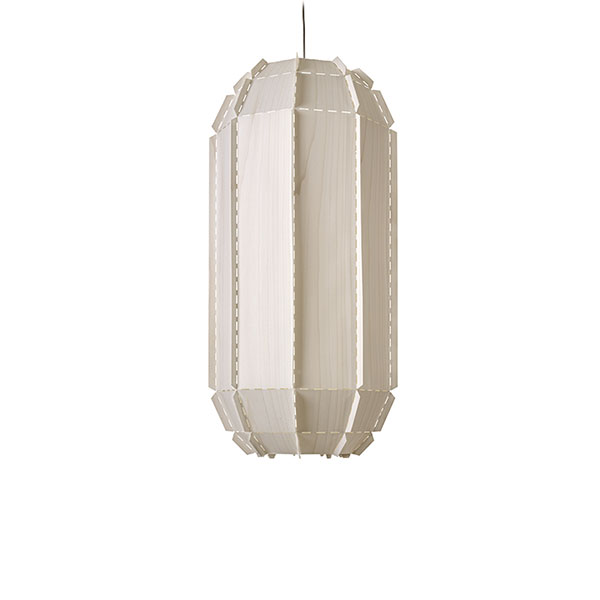 Egbert-Jan Lam of Netherlands-based Burojet Design Studio created Stitches, a family of two well-hemmed pendants. Named Djenné and Bamako (after towns and cities in Mali), each light has its own distinct pattern. Veneer lengths are crafted in a traditional sewing fashion: by marking out a pattern, cutting it and then repeating, so producing an individual lamp. Light shines through the Stitches lamps’ visible hemstitching, cleverly simulating the embellished stitches found on cloth. The shape of each Stitches lamp alludes to the adobe mosques found across the West African nation of Mali. Moreover, Mali has a long history as a producer of embroidery, something embodied in Stitches.
